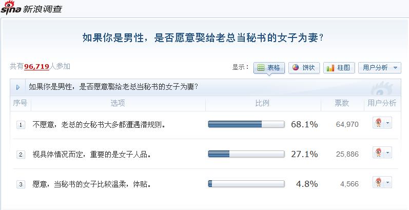 A pool involved 96,719 Chinese netizens showed that 68.1% male wouldn’t want to marry a woman who works as a secretary. I predicted that my male fellows wouldn’t like this occupation but I was hoping at least some of them would be supportive.