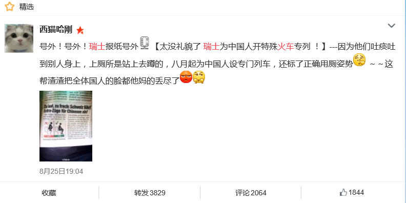 Some users try to explain the culture of squatting on the toilet in China. Although ‘western-style’ toilets are popular in China’s bigger cities and airports, there are still lots of squatting toilets, especially in rural areas. Weibo user “JaneyPan” says that from a physiological standpoint, squatting is the best toilet position. “If you are used to squatting, you just can’t poo by sitting on the toilet. But I agree that we need to clean the footprints afterwards.” She then adds: “Maybe the Switzerland railway should consider building squatting toilets on the carriages meant for Chinese tourists.”