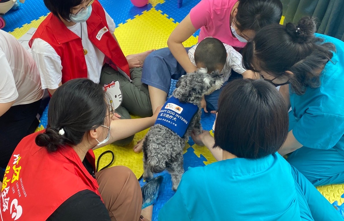 When the talent show is over, the children are divided into pairs, stroking and playing with the therapy dogs under the supervision of Wu and other volunteers. After a few minutes, several children who began the session crying and screaming ask to walk the dogs in the corridor.